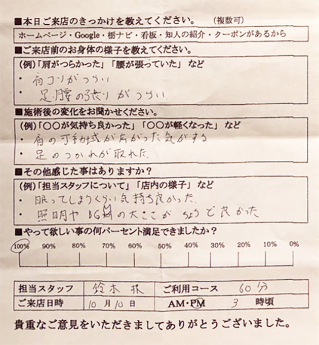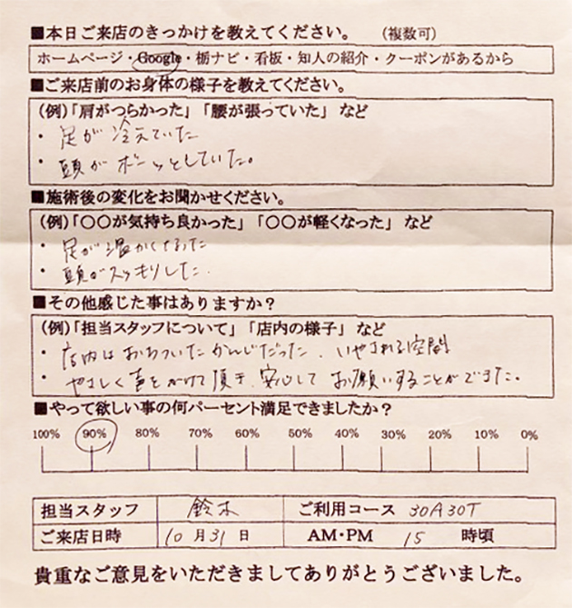 ≪整体施術当日の流れ≫① 当整体サロンのカウンセリング表を記入いただき、現在の辛さをお聞きします。